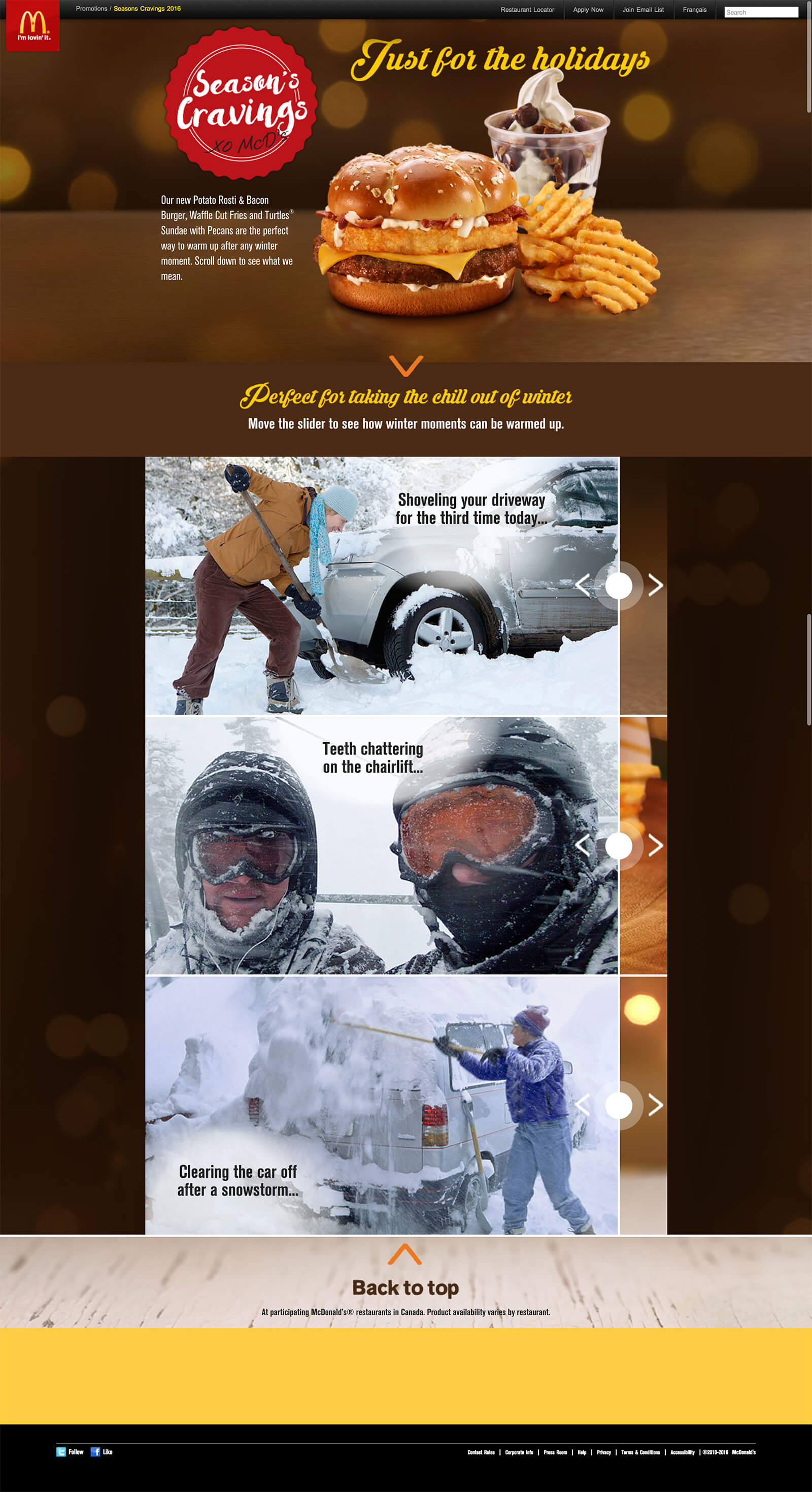 Annually, McDonalds launches their Season’s Cravings holiday menu campaign consisting of unique sandwiches, accompaniments, desserts and beverages. 2016's request was to design a beautiful website, digital advertising and clever social media to promote the new menu. The campaign was met with great success. Boasting sales, unique sandwiches increased by 15%.